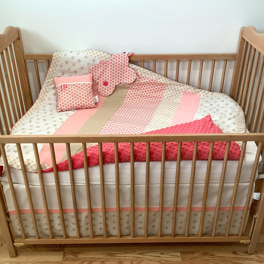 3 piece set for cribs. The set contains the comforter, the fitted sheet and the bed skirt.