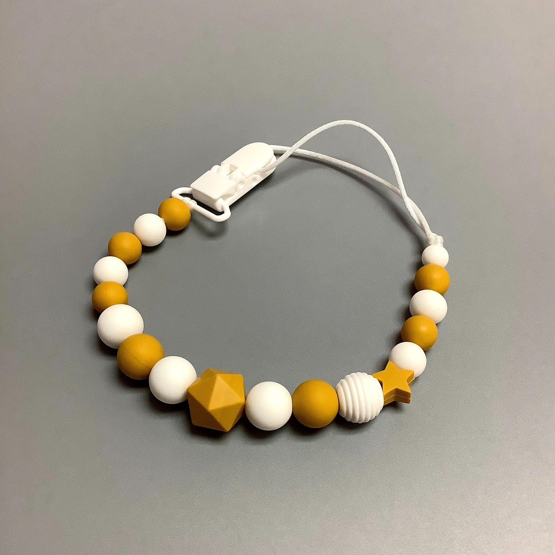 Silicone pacifier clip made with several silicone balls of different colors, sizes and shapes, and it is completed with a plastic clip.