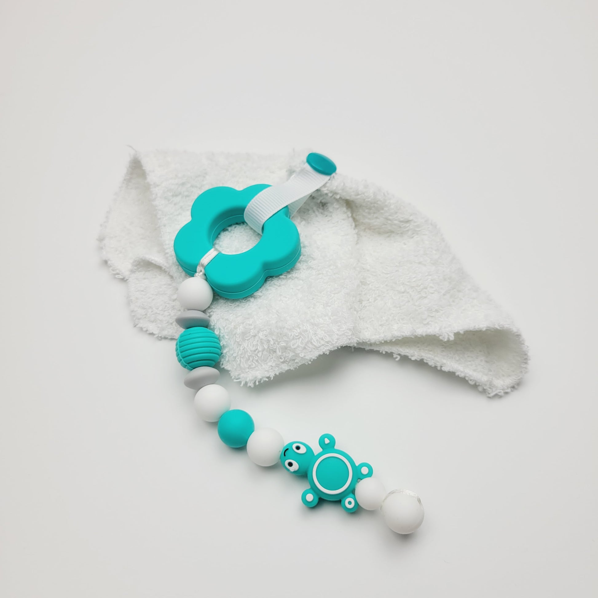 C'est un jouet de dentition que les bébés peuvent mâchouiller et au bout vous avez une serviette absorbante que vous pouvez trempé et que les bébé tèterons sans arrêt. Ce jouet ainsi que la serviette peuvent aller dans le congélateur.