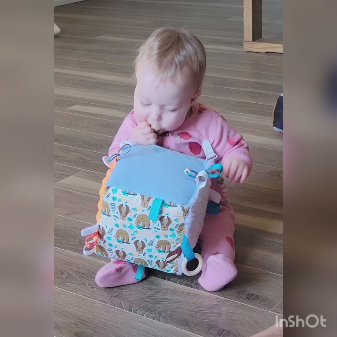 Découvrez un jouet d'éveil, un jouet de dentition ou un jouet sensoriel. Le cube et le ballon d'éveil sont des jouet complet pour les bébés. Le cube aide au développement de la motricité fine, il peut devenir un jouet de dentition pour les gencives sensibles de bébé et grâce à toutes les textures et le son qu'il fait à l'agitant c'est un jouet qui éveil les sens.