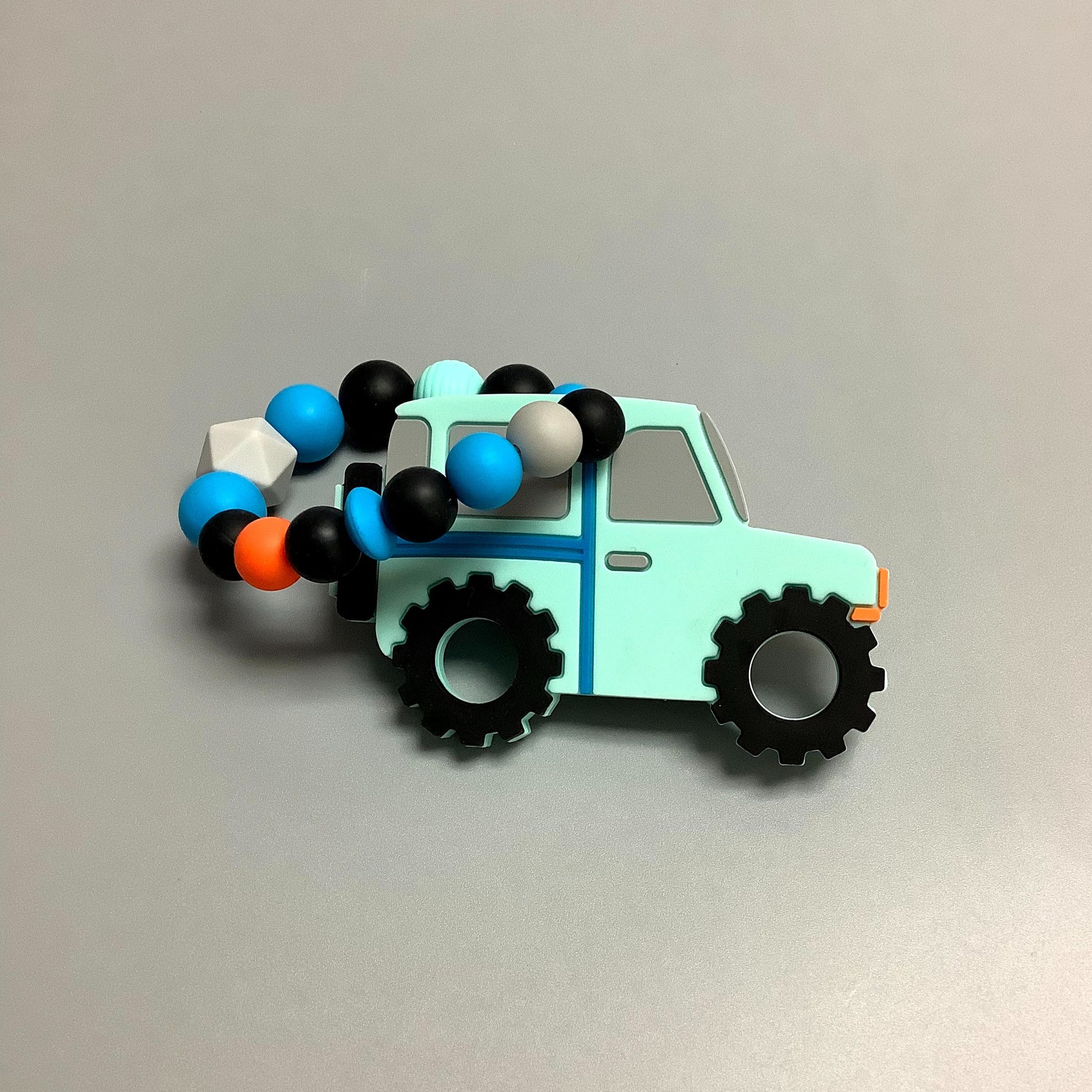 Hochet d'éveil en silicone fait avec plusieurs billes en silicones de différentes couleurs et différentes tailles avec une plus gros jouet de dentition.