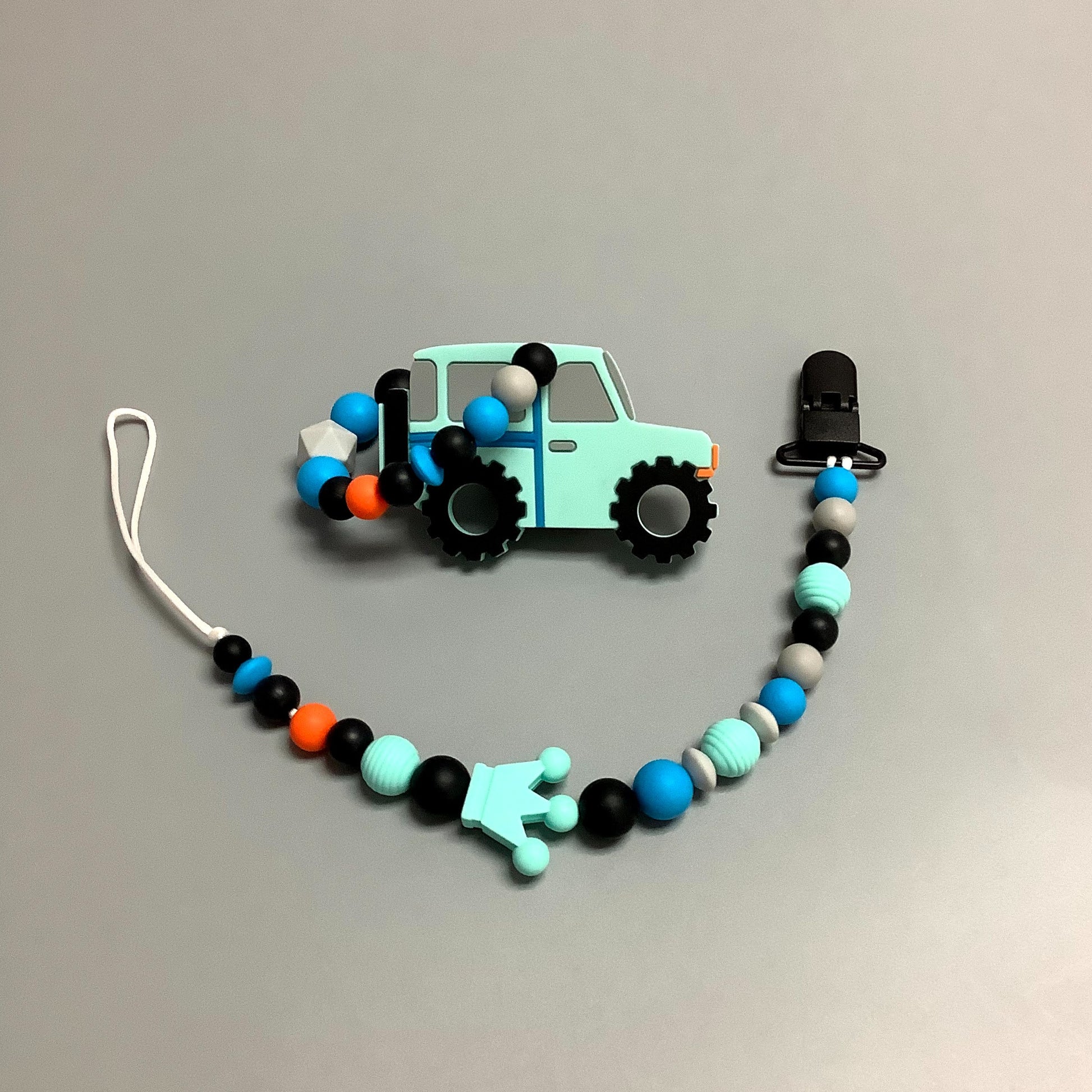 Attache-suce en silicone fait avec plusieurs billes en silicones de différentes couleurs, tailles et formes, et il est complété par une attache en plastique.